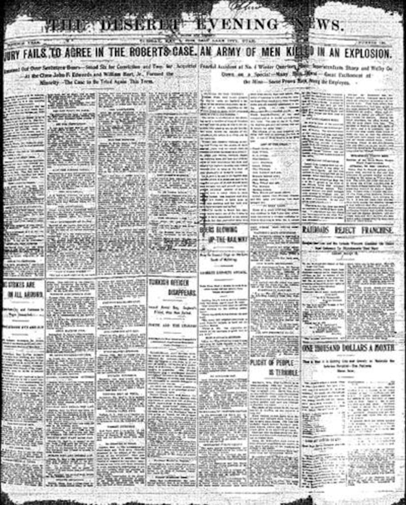 This May 1900 issue of the Deseret News reported on the Scofield mine disaster, which occurred on May 1, 1900, when an explosion ripped through mine No. 4, killing more than 200 men.