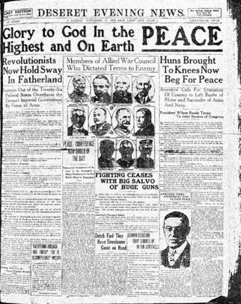 The November 11, 1918, Deseret News proclaimed, “Announcement is made that the German delegates signed the armistice terms at six o’clock (French time) Monday morning.