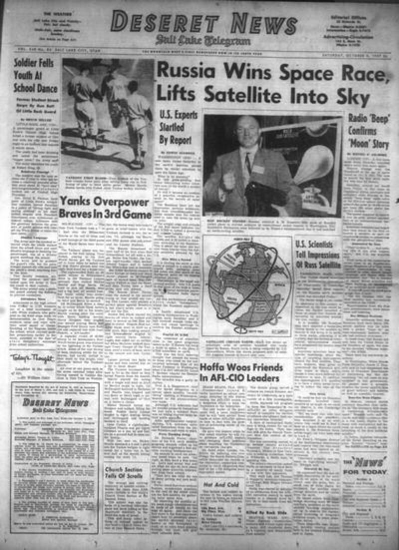 On October 4, 1957, the Soviet Union launched its satellite Sputnik into orbit, with the news reported here in the October 5 edition of the Deseret News.