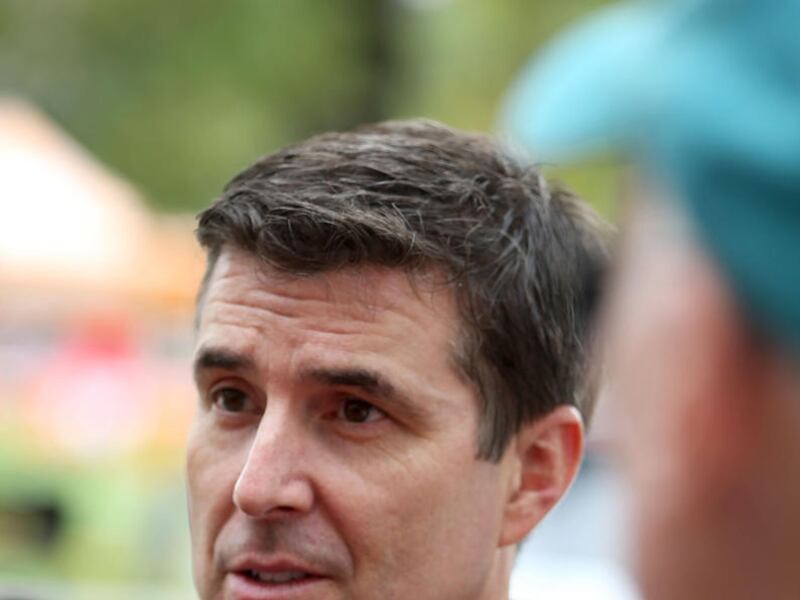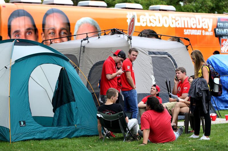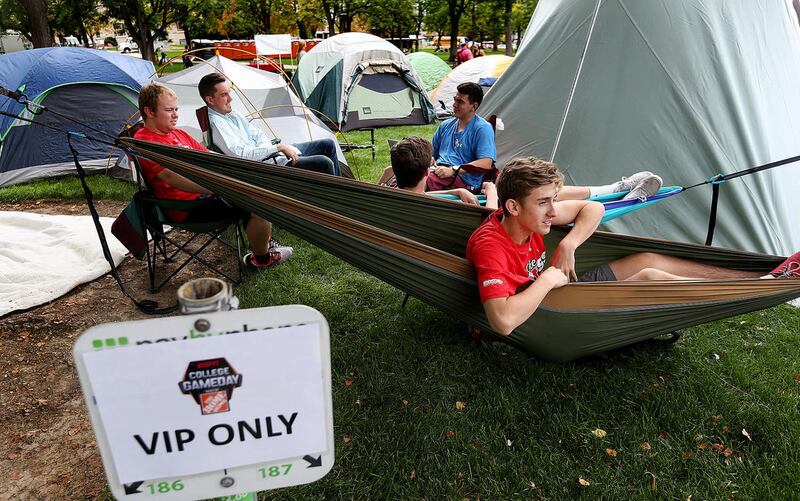 Seven semi-trucks were parked in the circle on Friday. Twenty portable bathrooms lined the parkway. A stage was erected for the on-air personalities, flanked by a big screen, speakers and grandstands. As of noon, 25 tents also had been set up by students hoping to land some airtime. One tent included a sign saying, “Camp Corso,” in honor of venerable ESPN personality Lee Corso.
