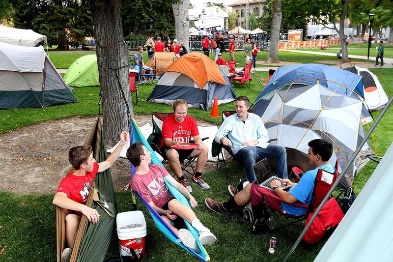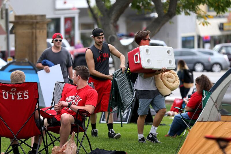 Marc Lodmell, a student at Utah, began staking his tent about 9 p.m. Thursday.