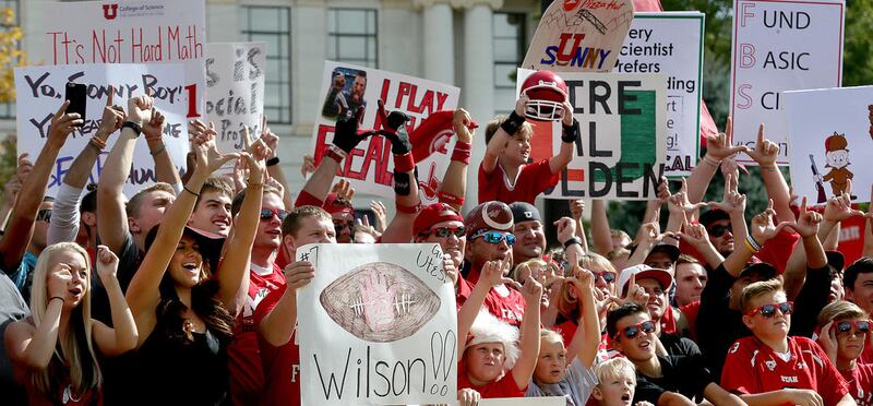 Salt Lake and the university had on their best faces Friday, thanks to a bright autumn afternoon. The crown of the administration building was wrapped in a banner proclaiming, “Welcome to Salt Lake City.”