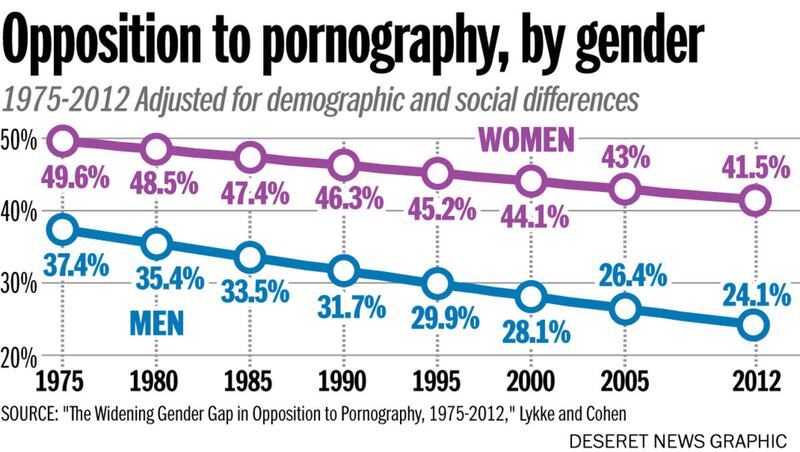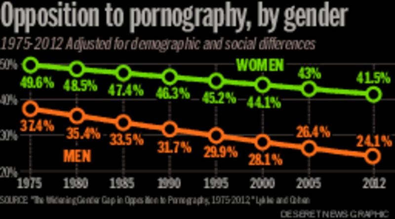 Public opposition against pornography has declined in the past 40 years. In 1975, 53 percent of women and 34 percent of men believed there should be laws against the distribution of pornography, according to a recent study. By 2012 it had fallen to 43 percent of women and 23 percent of men.