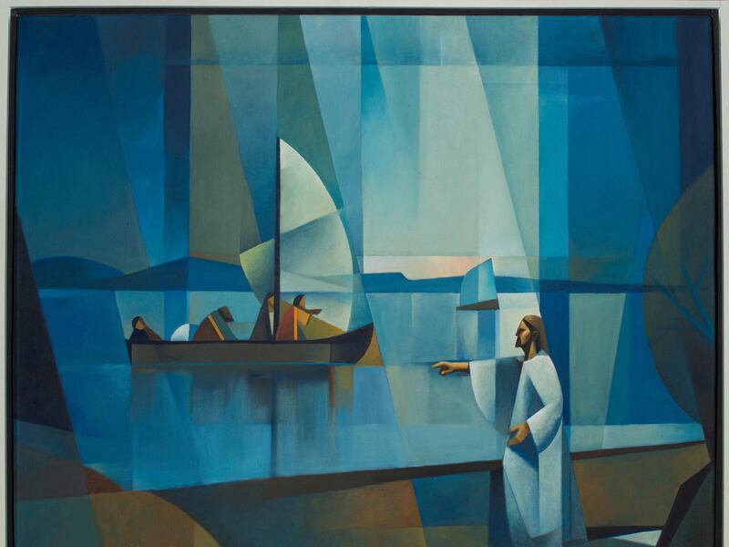 Argentinian artist Jorge Orlando Cocco Santangelo’s “The Call” depicts Christ as he walks by the Sea of Galilee, calling his first apostles, Peter, Andrew, James and John. Awash in complementary blues and whites, the work’s abstracted planes of geometric forms are reminiscent of Picasso’s cubism.