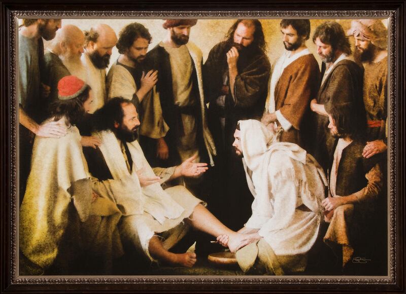 Scott Lynn Sumner’s “I Have Given You an Example” shows Christ as a centrifugal force among a crowd of followers. His presence is dominant yet humble as he converses and attends to the individuals surrounding him.