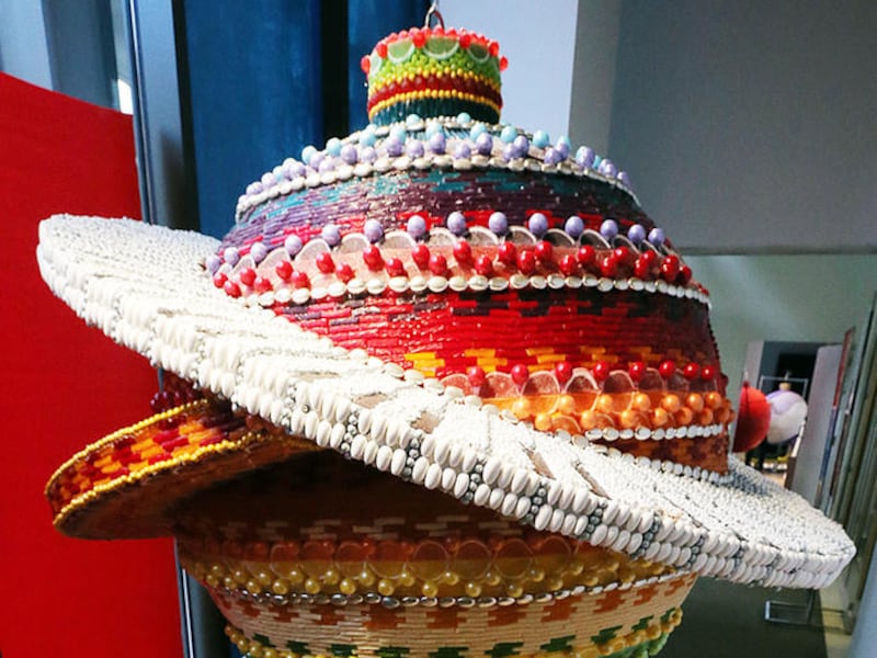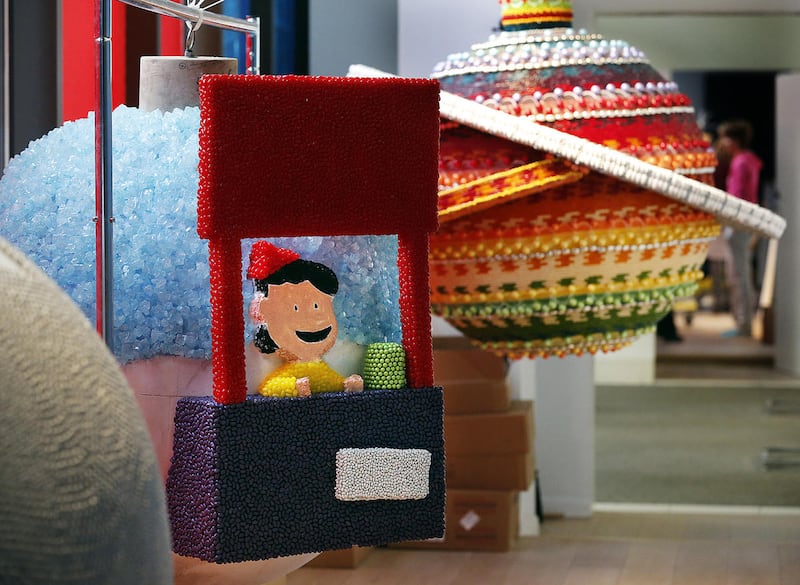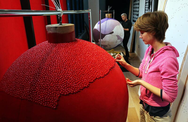 Each ornament is built with a 42-inch-diameter plastic foam ball as its base and is decorated with candy, paint and other materials.