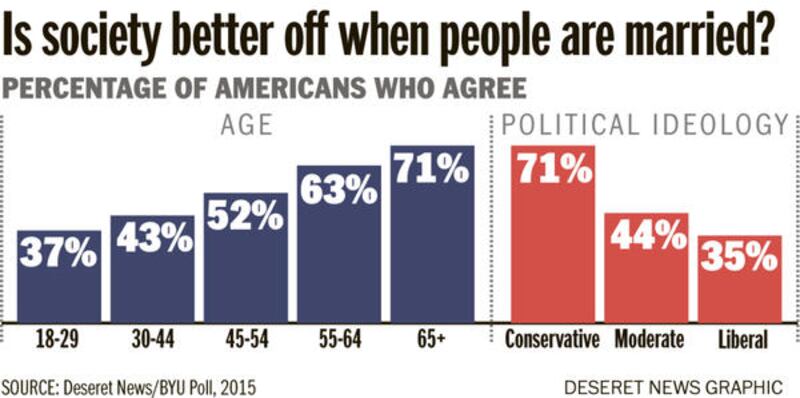 Conservatives were more likely to say society is better off when more people are married, the survey found. Close to 90 percent of conservatives agreed with the statement, compared with less than half of liberals.