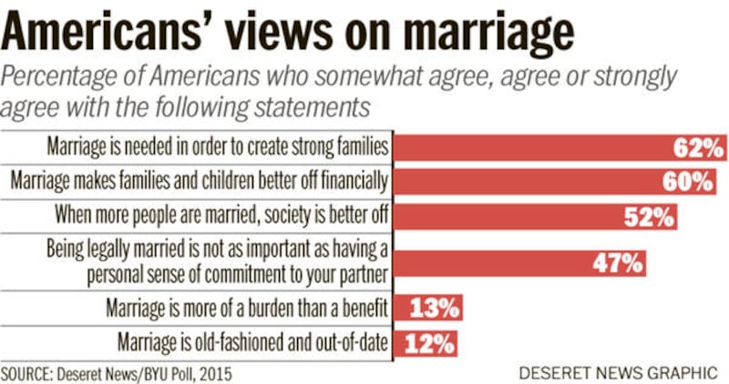 Asked if marriage is out-of-date, 71 percent of Americans said no, compared to 12 percent who said yes. Six in 10 felt marriage makes families and kids better off financially; 15 percent disagreed. Asked if marriage is needed to create strong families, 62 percent said yes, 22 percent no.