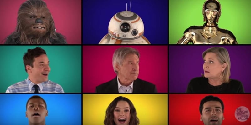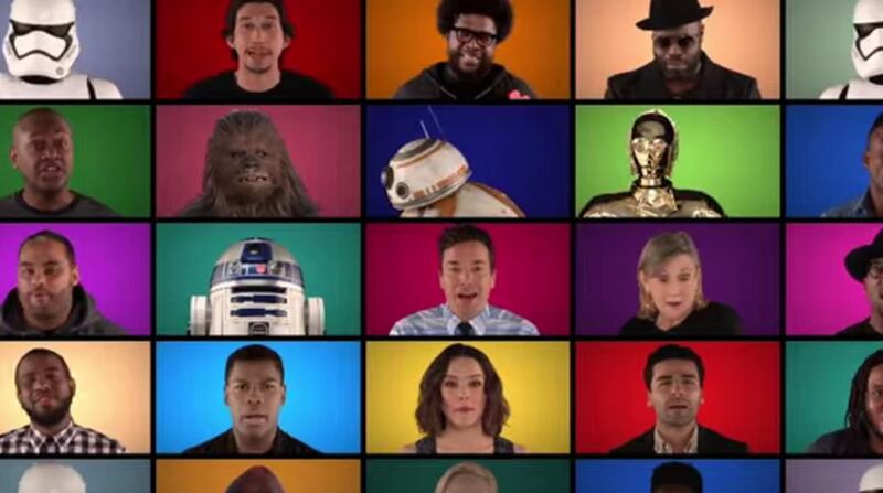 In honor of this week's release of "Star Wars: The Force Awakens," cast members from the upcoming movie and the franchise's earlier films joined "Tonight Show" host Jimmy Fallon and the band The Roots to perform an a cappella tribute.