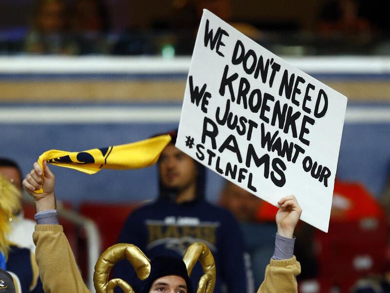 Fans chanted "Keep Our Rams! Keep Our Rams!" and carried signs, one of them reading "We Don't Need Kroenke, We Just Want our Rams."