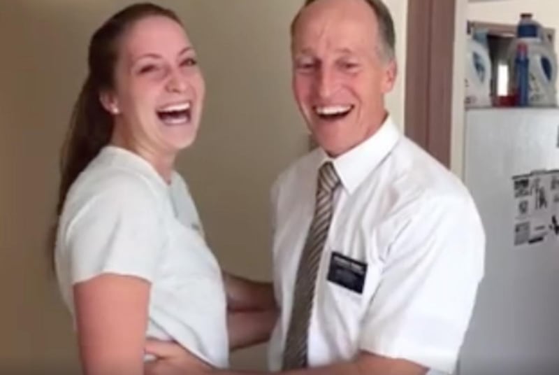 In the video, the siblings knocked on their parents' door. Their father, President Brent Romney, was astounded to see them and exclaimed, "Oh my heavens!"