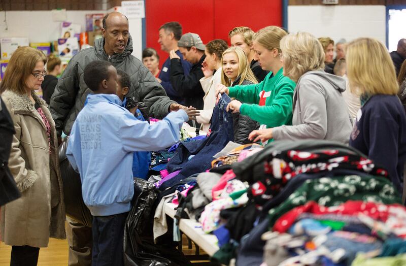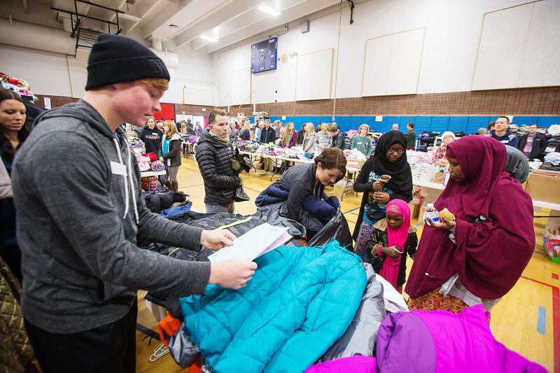 Ram Ceuthawng looks at items on the tables as about 300 volunteers gather Christmas Eve morning at the old Granite High School in South Salt Lake to distribute two semitrailer loads of donated goods to refugee families Thursday, Dec. 24, 2015.