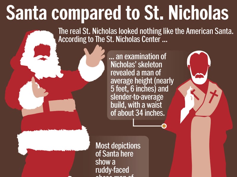 These depictions are more in keeping with the real St. Nicholas, the fourth-century bishop who was the inspiration for the modern Santa Claus and whose remains were analyzed in 1957. According to Carol Myers, of Holland, Michigan, who created The St. Nicholas Center (stnicholascenter.com) in 2002, an examination of Nicholas’ skeleton revealed a man of average height (nearly 5 feet, 6 inches) and slender-to-average build, with a waist of about 34 inches. His teeth indicated a diet that was mostly vegetarian, she said. A Greek who ate in the Mediterranean style that has become a dietary craze, Nicholas would have spent a lot of time walking, and “I’m sure he was reasonably fit,” she said.