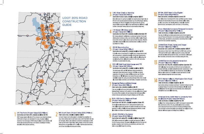 The Utah Department of Transportation Friday announced its list of the 15 major road projects for the year spanning from the Wasatch Front to southern Utah.
