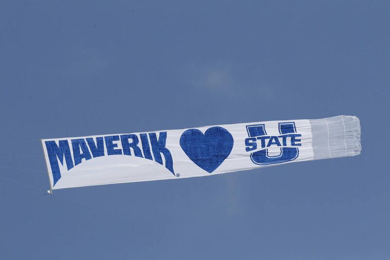 As a biplane flew overhead pulling a banner that declares “Maverik loves Utah State” on one side and “Utah State loves Maverik” on the other side, Albrecht described the partnership between USU and Maverik as “a whirlwind romance” that first started to come together in early February.