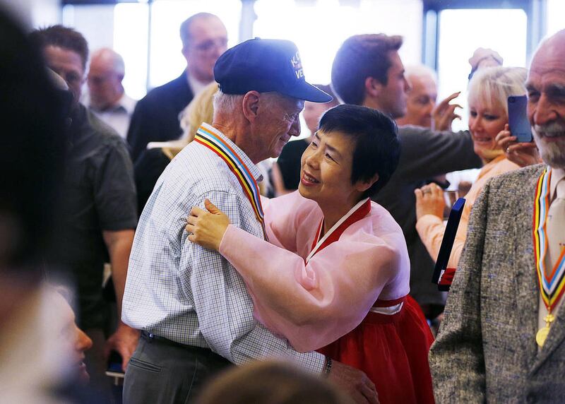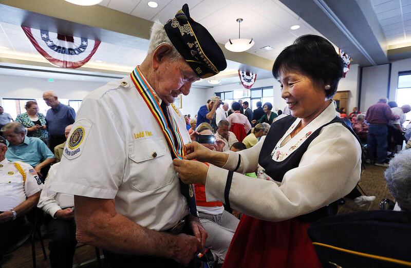 Traditionally dressed women from the Korean American Federation of Utah took to the aisles to hang medallions around the 117 veterans' necks, as many were unable to rise from their chairs. The medals are made of reforged barbed wire from Korea’s 38th parallel, which marked the border between North and South Korea.