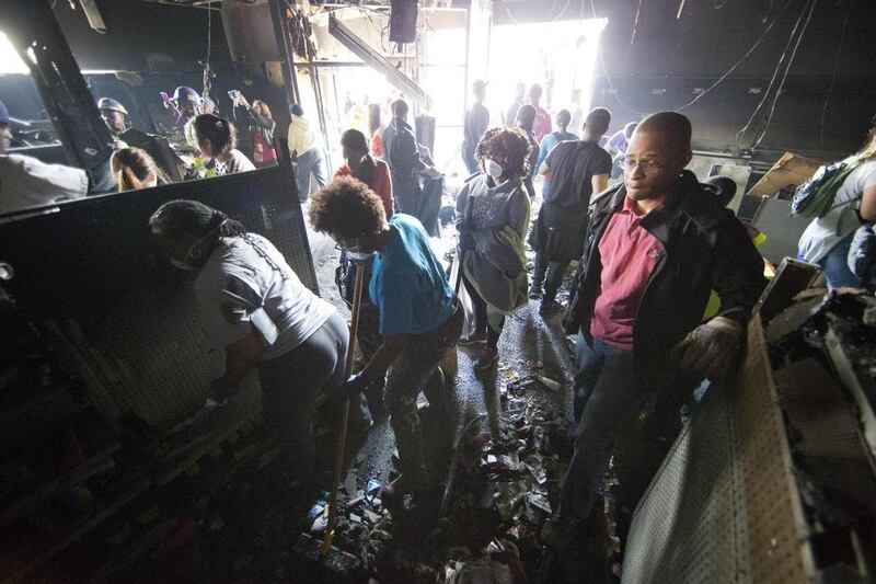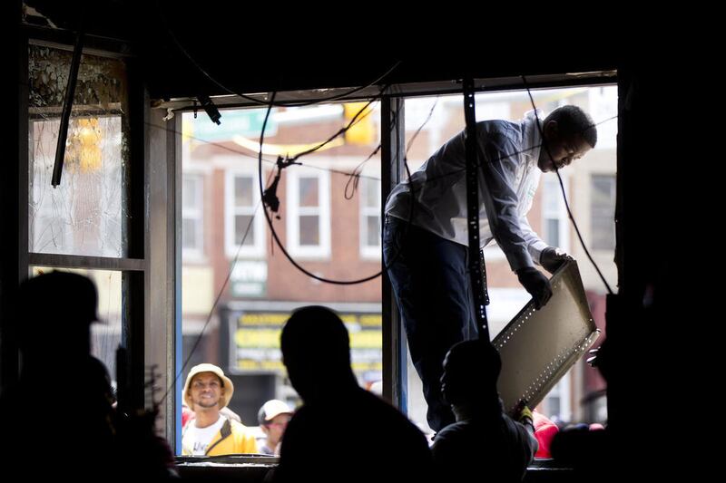 Part of the area was blocked off by officers to help with debris removal. Area hardware stores donated trash bags and brooms, and city workers brought in trucks to haul away mounds of trash and broken glass.