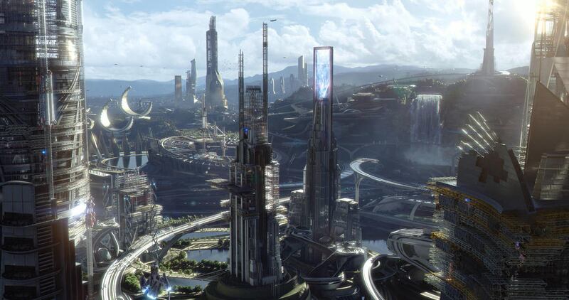 But “Tomorrowland” is about hope. So one evening a mysterious recruiter named Athena (Raffey Cassidy) gives Casey an even more mysterious pin. The pin acts as a sort of dimensional portal; by touching it, Casey is transported to an alternate utopian reality, complete with futuristic buildings, efficient public transportation and a sleek space program.