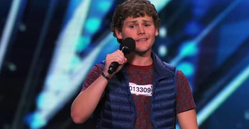 A stuttering comedian fell to his knees after the judges on NBC's "America's Got Talent" gave him a standing ovation and cleared him to move on to the next round and compete for the prize of $1 million on this year's season of the show.