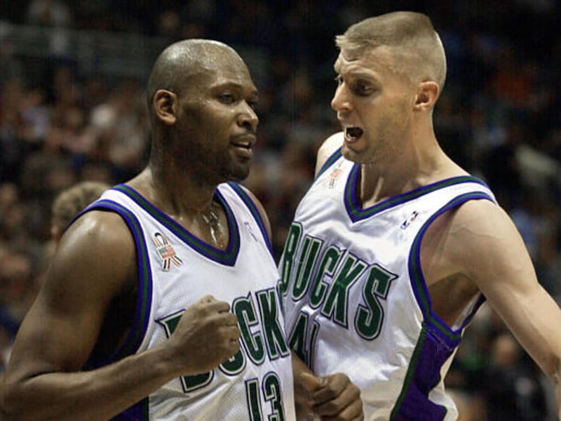 He started the season on injured reserve, and then the Bucks’ starting power forward, Darvin Ham, broke his leg. “The next day Coach is talking to the team, and he’s talking like I’m going to start,” recalls Pope. “I have no idea if I’m on IR. So he puts out the starting unit and sure enough he’s got me out there. As we go through the game plan, I see we are not doubling the post. I’m going to start against Kevin Garnett and Coach is not bringing help. It was sheer terror. Kevin had a terrible game. I think he was just annoyed because he was being guarded by a no-name guy. He got upset at me. In the third quarter he hit a couple of shots and starts cussing at me, ‘You can’t guard me!’ and gets T’d. For a fan it was awesome.”