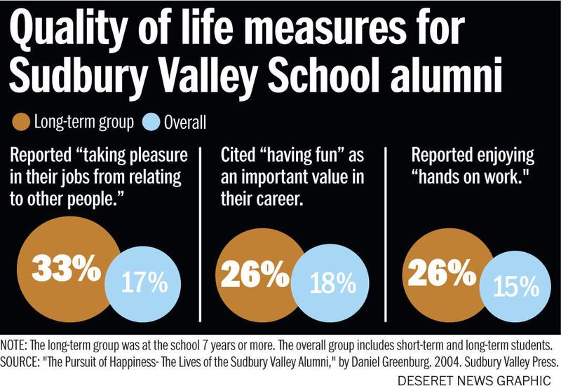 Most notably, Greenberg’s study found that students who spent seven or more years at Sudbury Valley School were, in their jobs, more likely to focus on fun, enjoy “hands on work” and enjoy relating to other people.