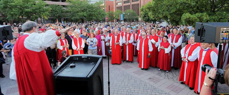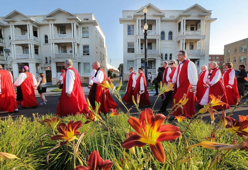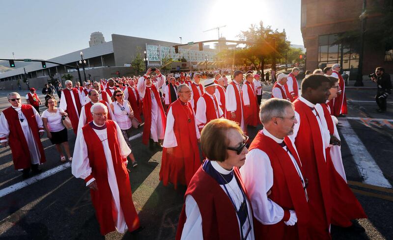 SALT LAKE CITY — A prayerful procession led by some 60 Episcopal bishops traveled through downtown Salt Lake City on Sunday morning calling for an end to the "unholy trinity" of poverty, racism and gun violence.