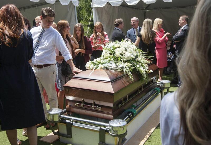 At the conclusion of the service, pallbearers wheeled the casket through two lines formed by the First Presidency and Quorum of the Twelve and other church leaders. Outside, the casket received the flag as a blanket before being lifted into a hearse.