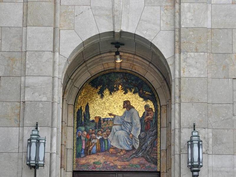 The exhibit, called “Wherefore By Their Fruits Ye Shall Know Them,” is captured in a photo of a mosaic of Jesus Christ teaching the Sermon on the Mount. The mosaic was designed by Mahonri Young, grandson of President Brigham Young, and was created for the Washington Chapel, a historic LDS meetinghouse in Washington that was built in 1933 and used until 1975. (see sidebar)