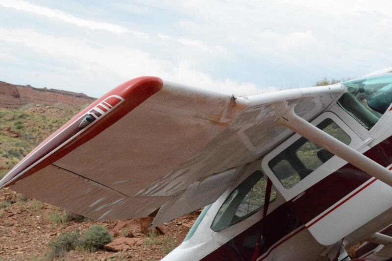 The Emery County Sheriff's Office said the Cessna 182 airplane was caught in a crosswind which carried the plane off the Hidden Splendor airstrip, clipping one wing and throwing the plane over the edge of a deep wash.