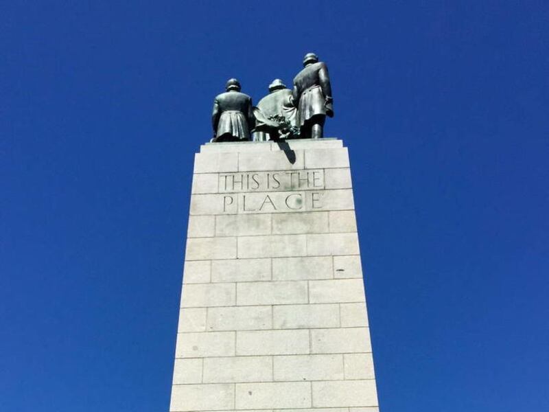 Another maker, erected at the base of the obelisk at This Is the Place State Park, states: