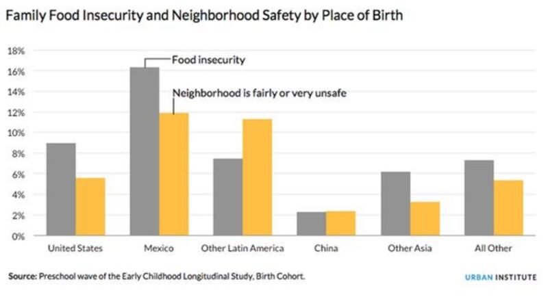 Urban also found that Latin American countries, especially Mexico, are more likely to have families that suffer from food insecurity or come from a dangerous neighborhood. Much like what was found in the data indicating educational attainment for mothers, China comes out on top (or bottom) in both categories.