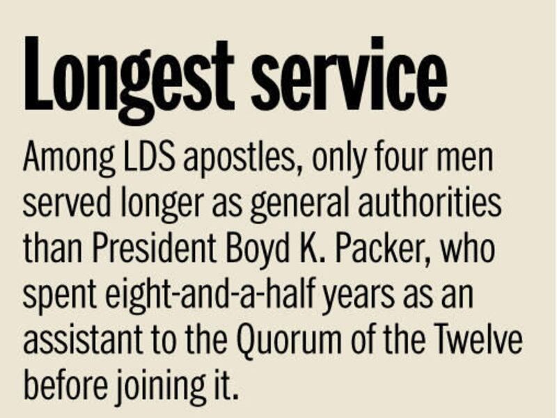 President Packer also was one of two remaining leaders who served in the discontinued position of Assistant to the Twelve; the other was Elder Robert D. Hales. He was 37 when he was ordained to that calling and became a general authority on Oct. 6, 1961 (two years before President Monson became a general authority).