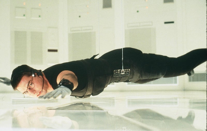 While filming the iconic scene where Ethan Hunt is suspended from the ceiling while trying to steal top-secret files from CIA headquarters, Cruise kept hitting his face on the floor until he MacGyver-ed a simple fix: He borrowed the change a stuntman had in his pocket, which he then put inside his shoes to help weigh his feet down.