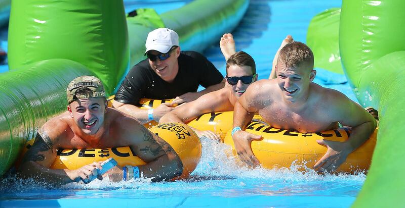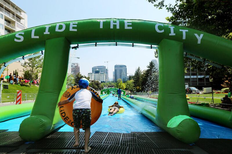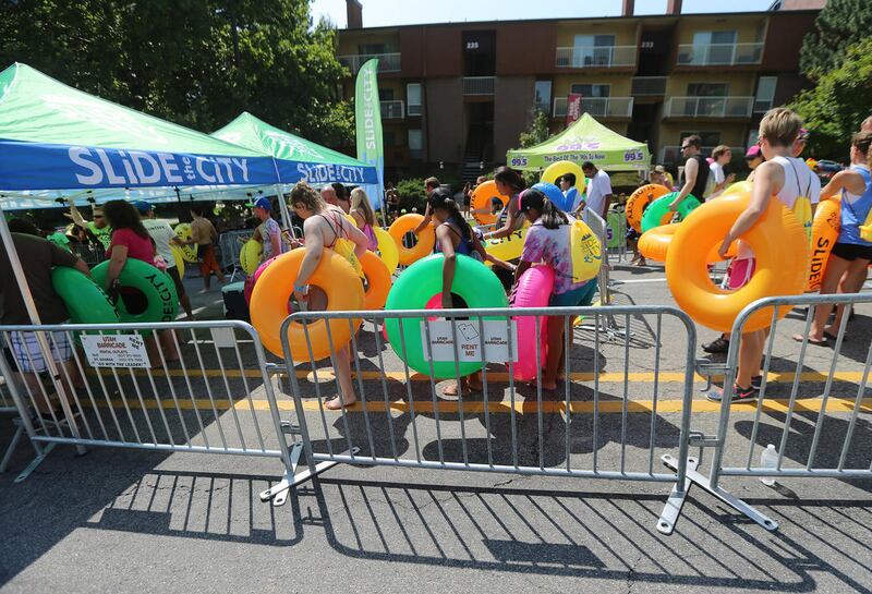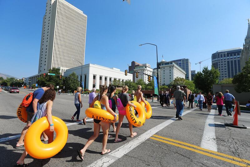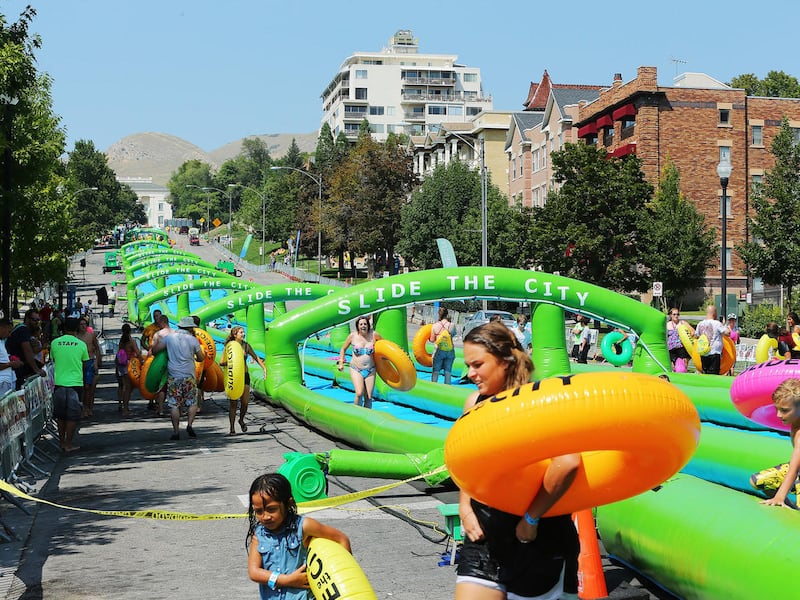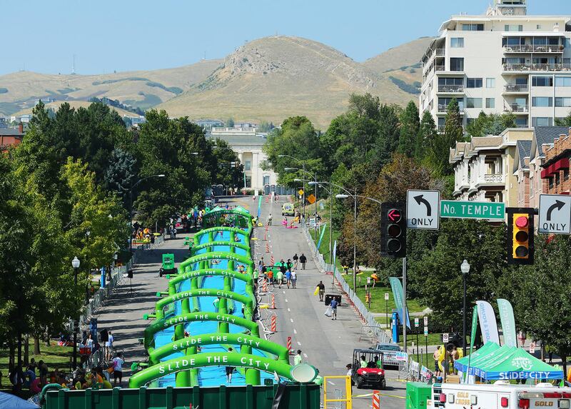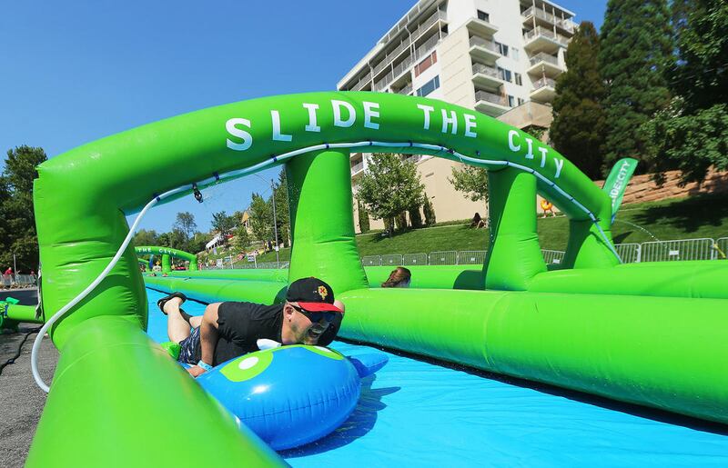 SALT LAKE CITY — Most chose to go on their bellies. Some slid on their backs. A few, the most adventurous, strapped GoPros to their heads or posed for selfies as they zipped down the 1,000 foot slip-and-slide on Main Street.