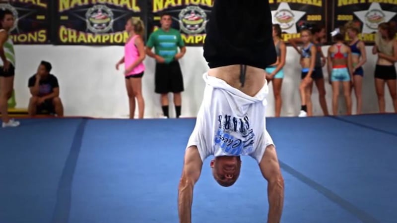 The proof he’s got game despite being older than half a century? A few months before the 2014 World Cheer Championships, Hirshberg’s team was in a bind and he ended up filling in as a competitor.