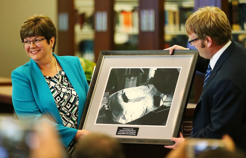 During the press conference, Elder Snow presented President Linkhart with a large framed photograph of the printer's manuscript and thanked the Community of Christ for their contributions to the project.