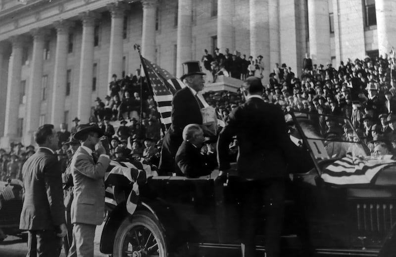 “At a brief stop in Ogden, Utah, he lashed out at 'pro-Germans' and claimed everyone opposed to the treaty was 'in cahoots' with Germany. His next major speech, in Salt Lake City (at the Mormon Tabernacle, to 15,000 people), was an incoherent mess. … As the train rolled toward the next speaking date in Wichita, Kansas (after a speech in Pueblo, Colorado), Wilson told his wife he felt horribly ill. … Waves of nausea were engulfing the president. He struggled for breath, his face twitched convulsively. The ache in his head had become intolerable.”