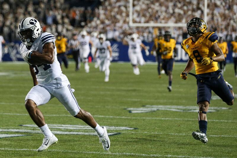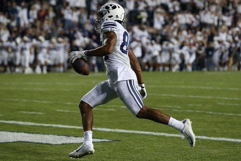 Couple @BYUfootball firsts in the first half: Here, Jonah Trinnaman scores his first TD for the Cougars on a 75-yard pass to open game pic.twitter.com/RuJ5jrJzhe