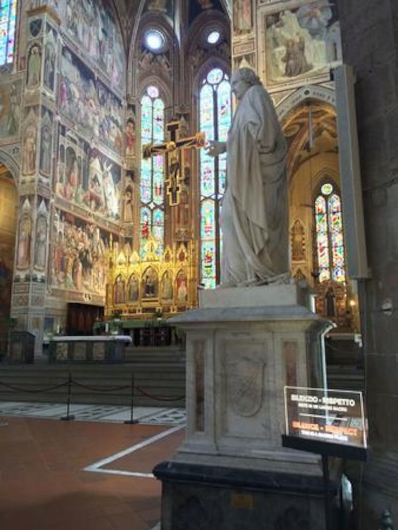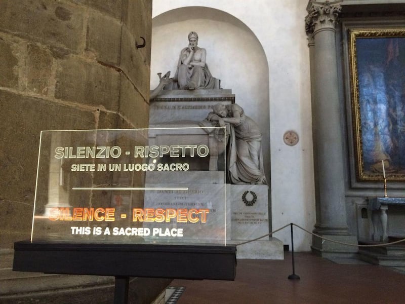 These are the sounds of most tourist attractions in Florence, Italy, but this one is supposed to be different. “Silence. Respect. This place is sacred,” the glowing electric signs read. They create beacons of red and blue artificial light in the midst of Basilica di Santa Croce's many shadows.
