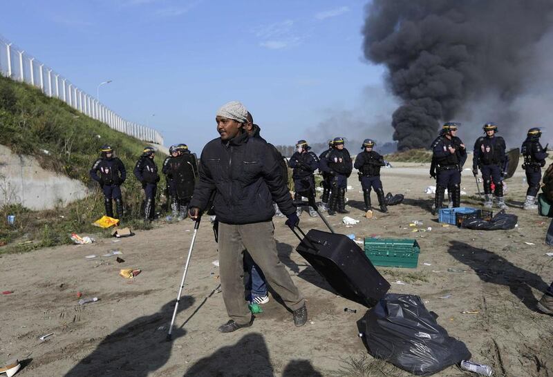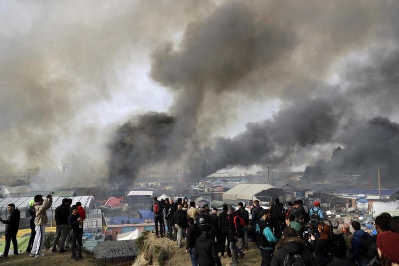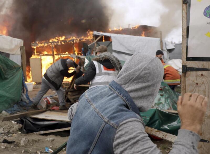 The main alley through the camp near the city of Calais burned overnight, leaving skeleton-like hulks on either side of the road. Firefighters delved into the camp's deepest recesses, trying to prevent a massive conflagration.