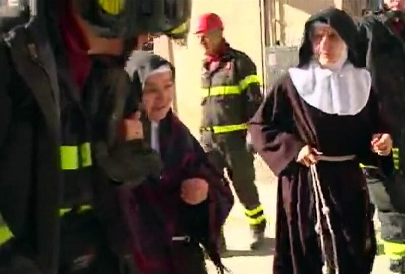Television images showed nuns rushing into the main piazza as the bell tower appeared on the verge of collapse. Later, nuns and monks knelt in prayer in the main piazza. A firefighter appealed to a priest to help keep residents calm in an effort to prevent them from looking for loved ones.