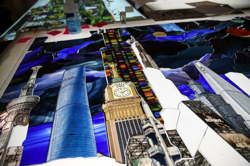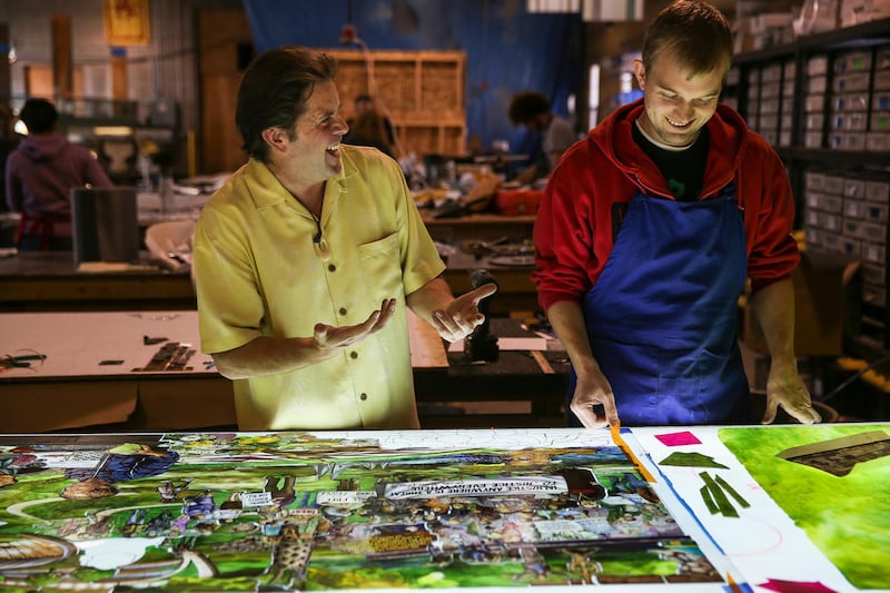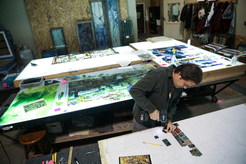 Tom Holdman works on The Roots of Knowledge, a 200-foot-long stained glass installation at Holdman Studios in Lehi, Utah, on Nov. 4, 2016. | Spenser Heaps, Deseret News