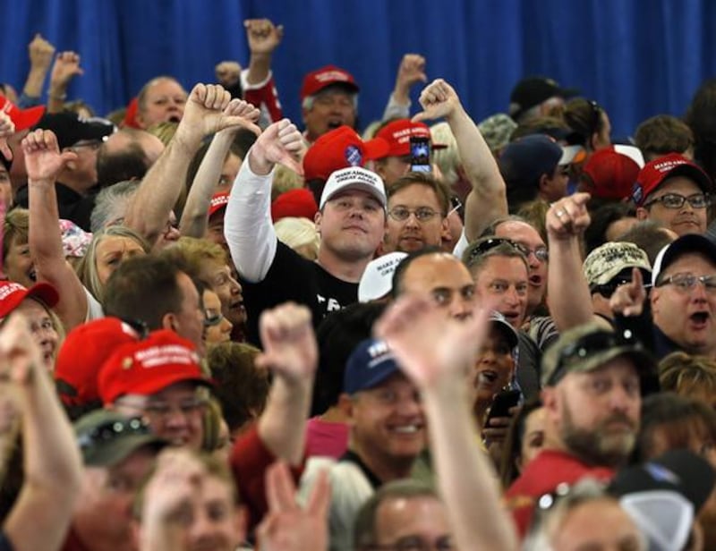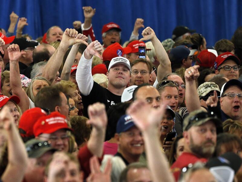 Trump supporters jeer at the media at a campaign rally for Republican presidential candidate Donald Trump on Oct. 29 in Golden, Colo. | Brennan Linsley, Associated Press