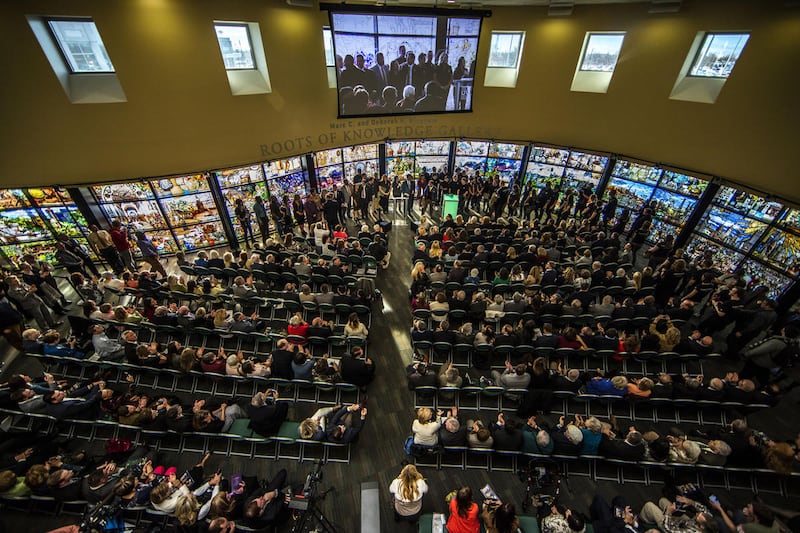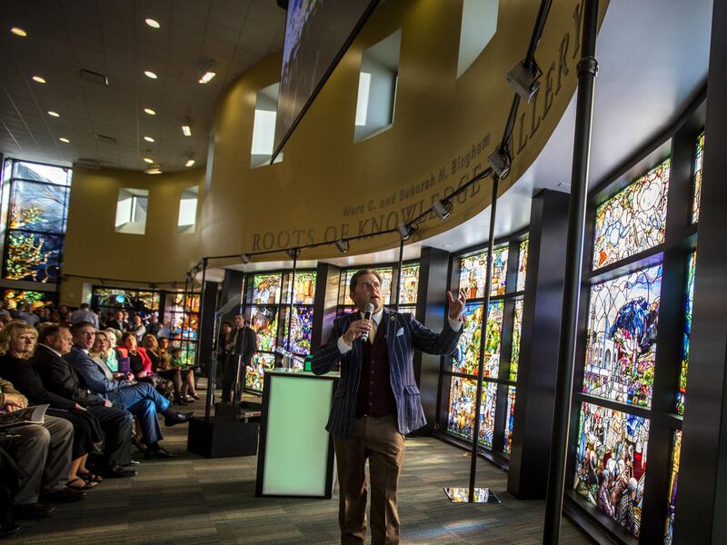 "Roots of Knowledge," as it is called, consists of 80 panels of stained glass that tell the story of human knowledge, starting with an image of a bristlecone pine named Methuselah known as one of the oldest living organisms in the world.