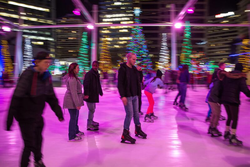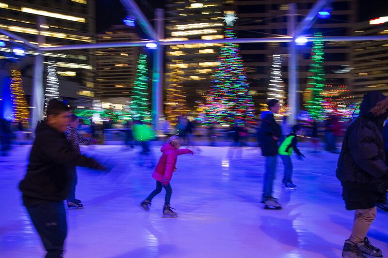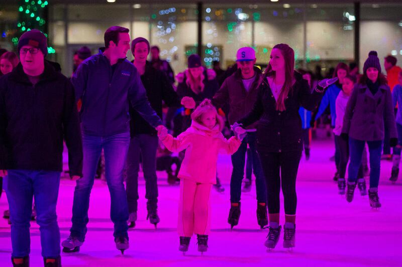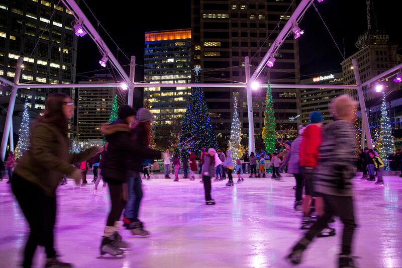At the Gallivan Center, Kris Fielding happily took photos of family members as they made their rounds on the outdoor ice skating rink there, under thousands of Christmas lights arranged throughout the plaza.