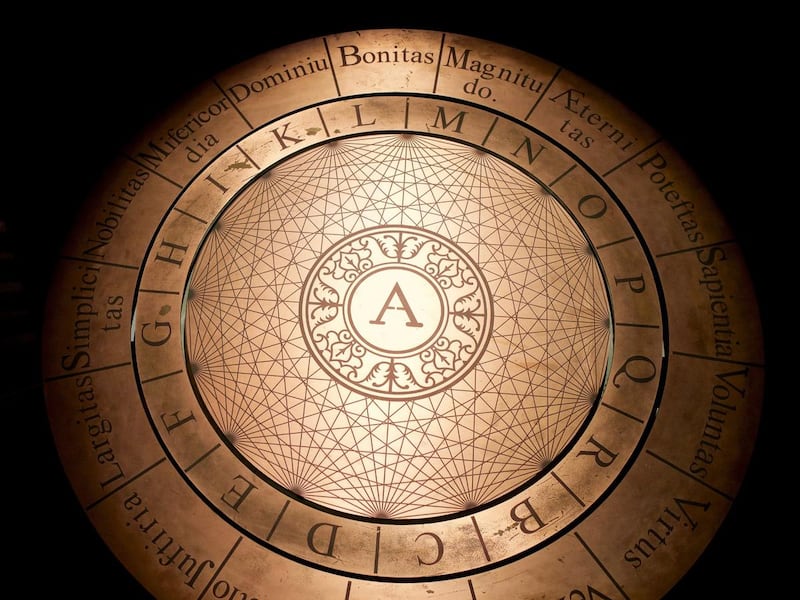 Lull then embarked on years of study and contemplation in a monastery on Mount Randa in Mallorca. The author of dozens of theological works in Latin, Catalan (medieval northern Spanish) and Arabic, Lull is most noted for his book “Ars Magna” ("Great Art"), in which he claims all knowledge can be circumscribed into a system of logic and mathematics that can demonstrate the truthfulness of Christianity. Mixing logic, symbolism, mysticism and theology with wild abandon, Lull generated a complex system of symbols and charts, most notably the Tree of Knowledge and the “Lullian Circle” , a complex system of interlocking rotating wheels of letters, words and symbols that illuminates his teachings.