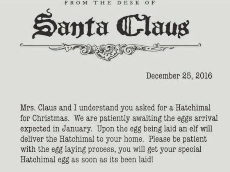 “Rather than risk disappointing their child if they can’t find a Hatchimal before Dec. 25, they’re preempting their kid’s Christmas morning tempter tantrum with a written apology letter from Santa Claus,” according to Scary Mommy, a parenting news website.