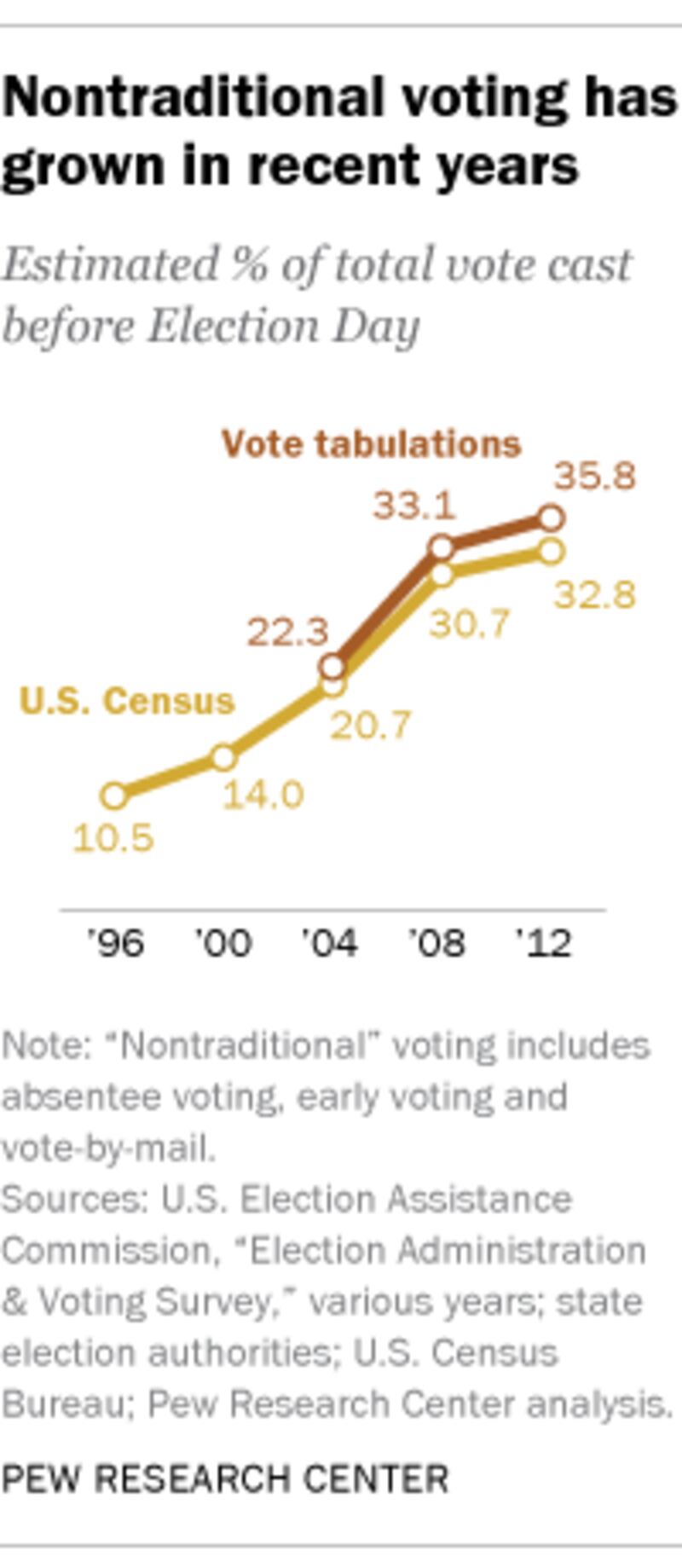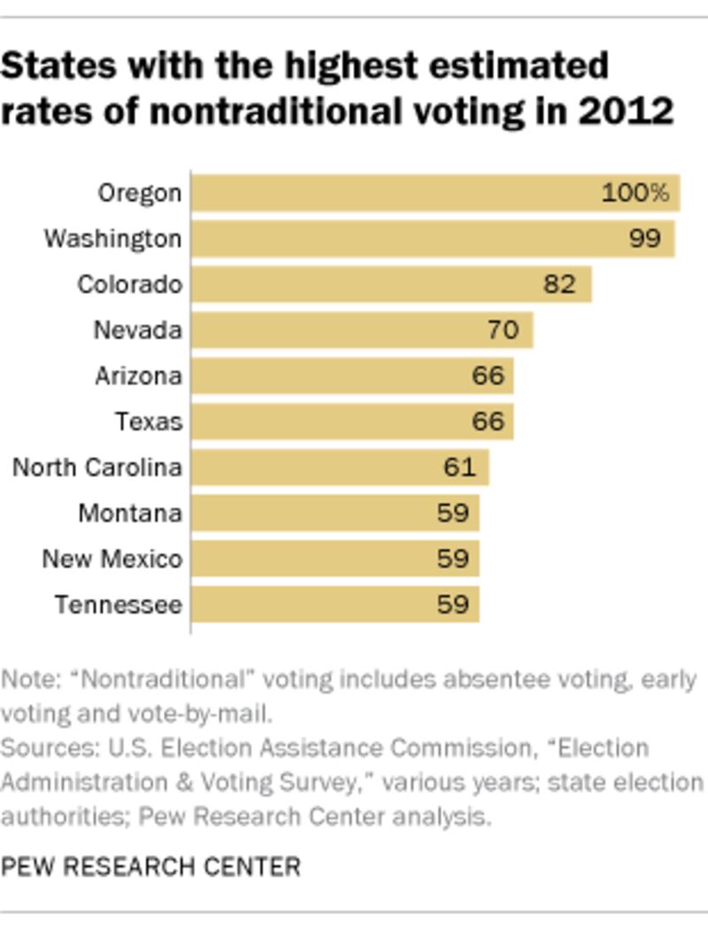 There are a few states that accept nontraditional voting more than others. In fact, there were 12 states in 2012 that had nontraditional methods account for more than half of the total vote, according to Pew.