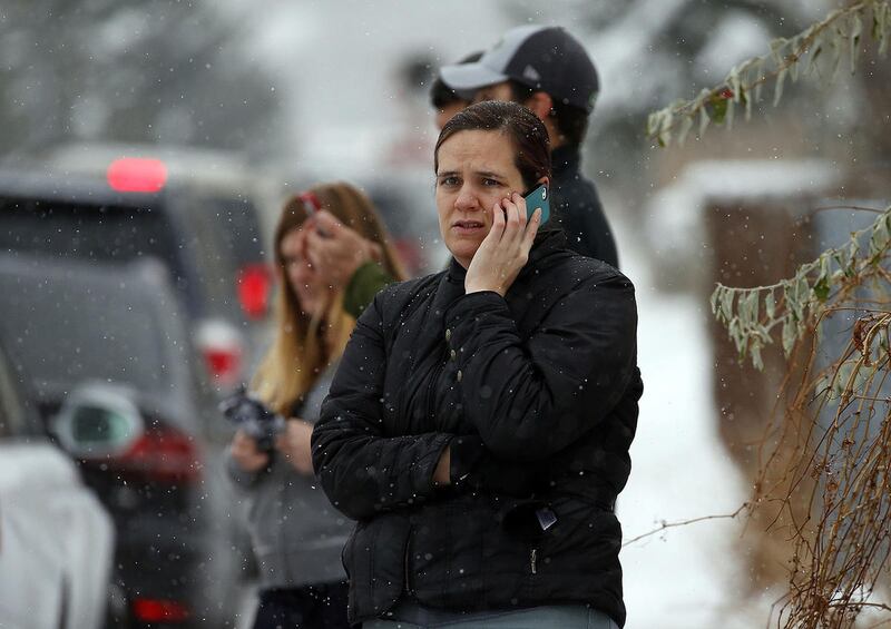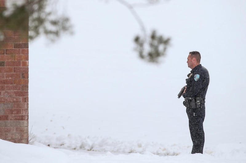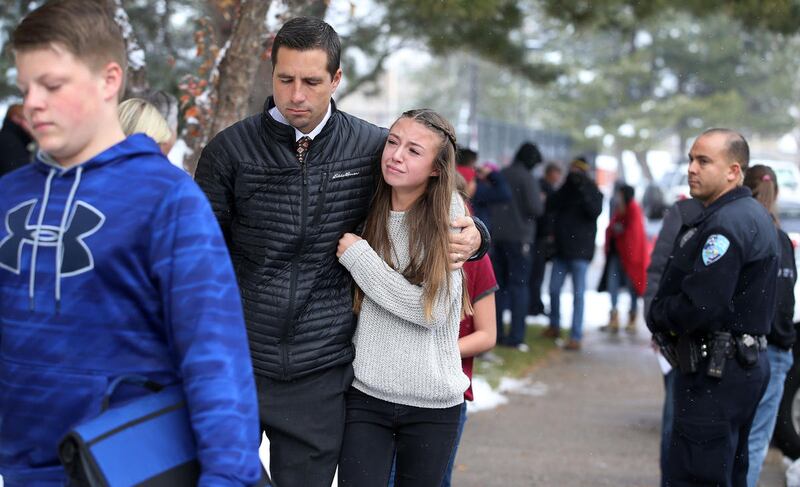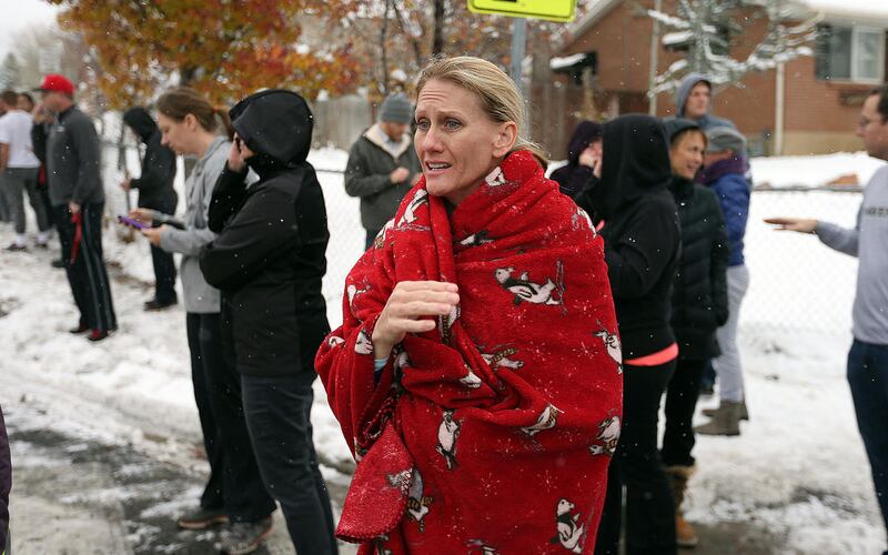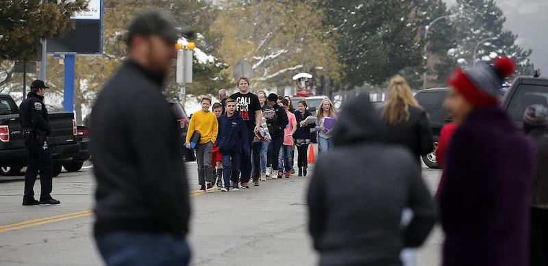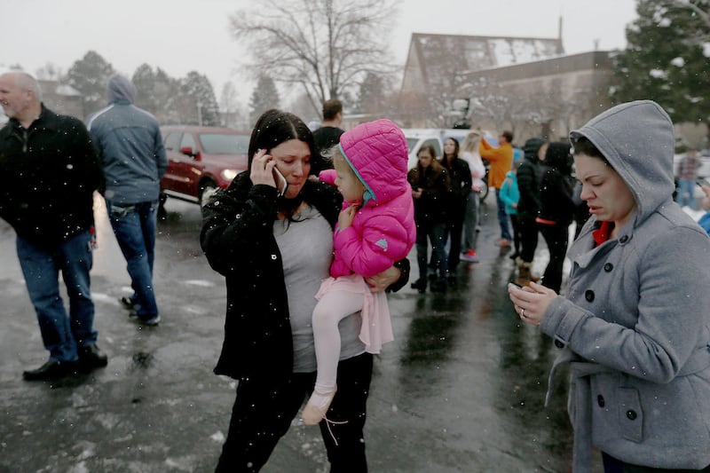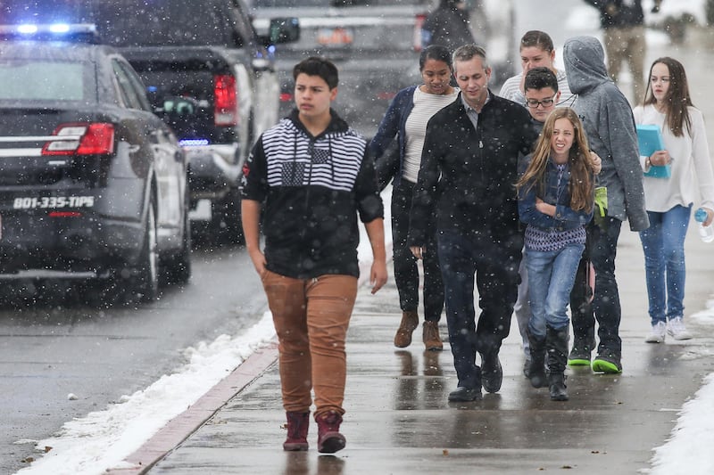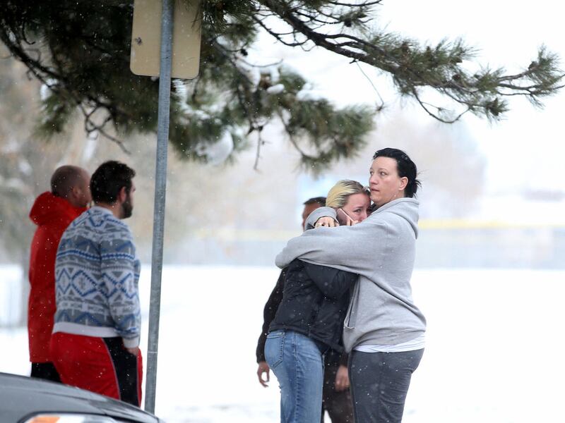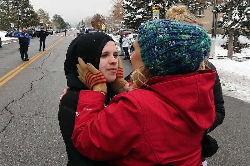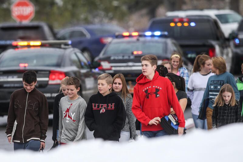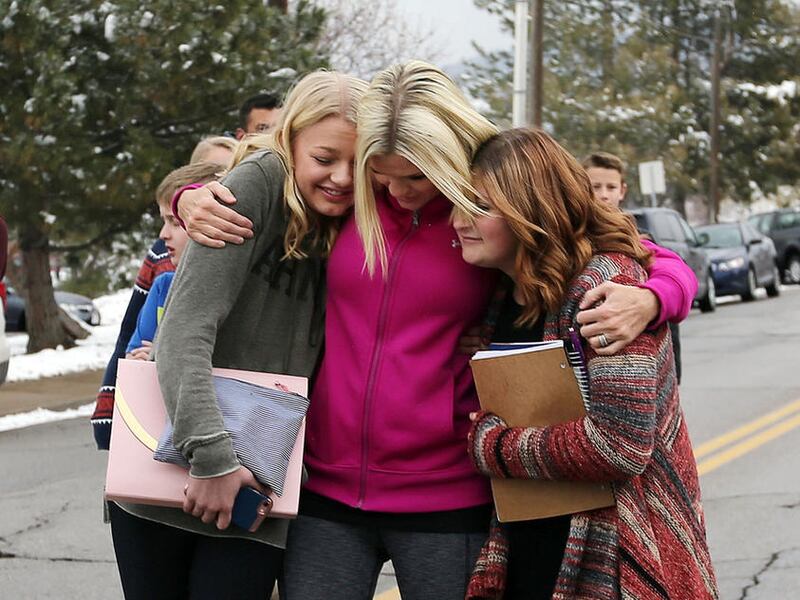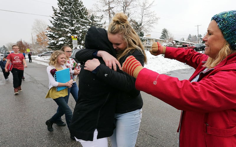 Dozens of anxious parents gathered outside in the snow and at an LDS meetinghouse across the street waiting to take their children home. Many parents and neighbors embraced as they arrived, some shedding tears and others making small jokes. Some were able to text their children inside the building. At least one parent said his son was nervous, but he felt a sense of reassurance because of the police response.