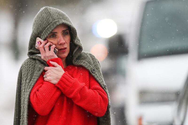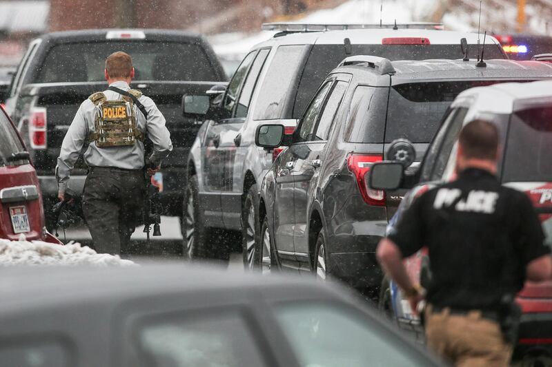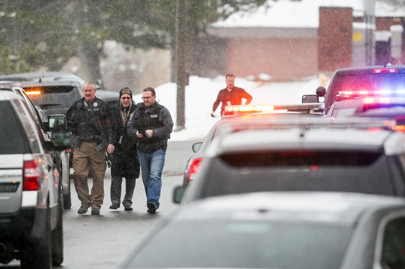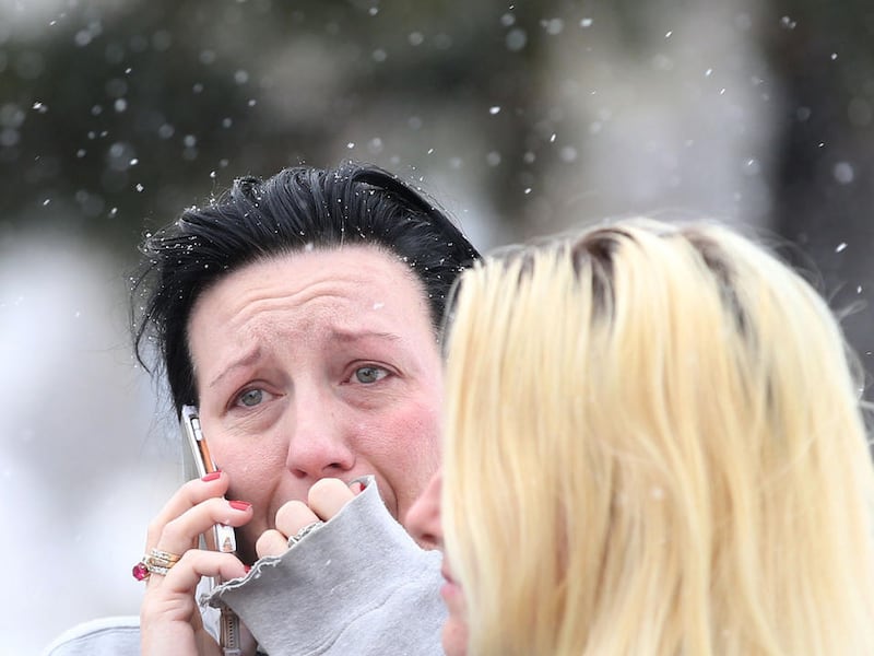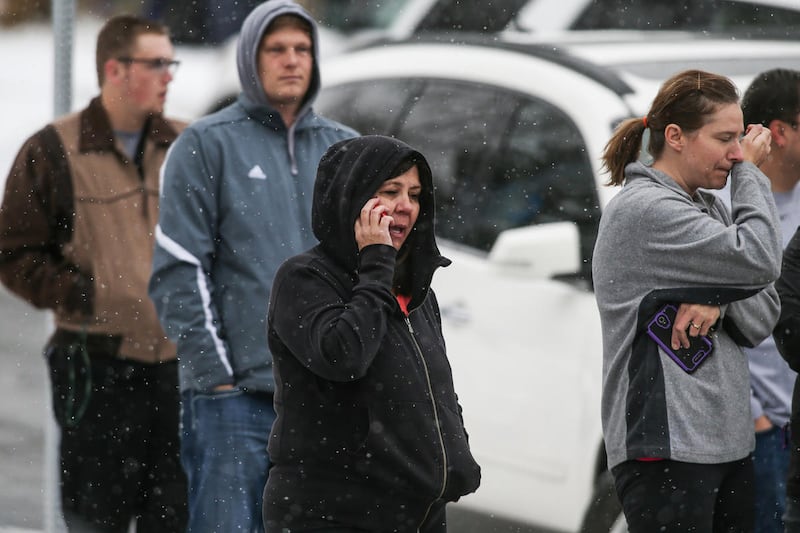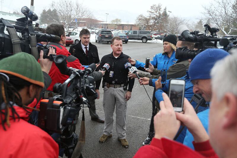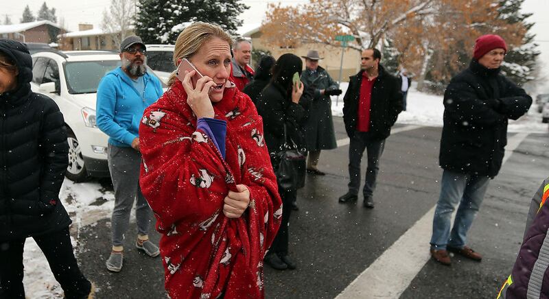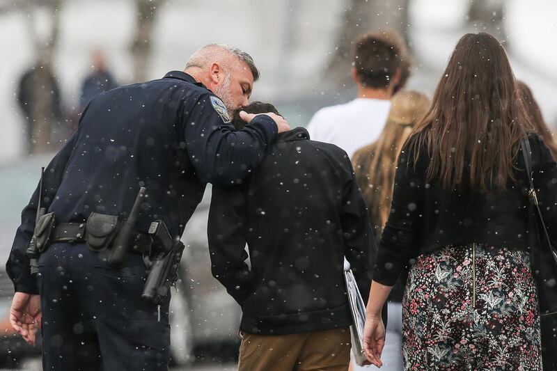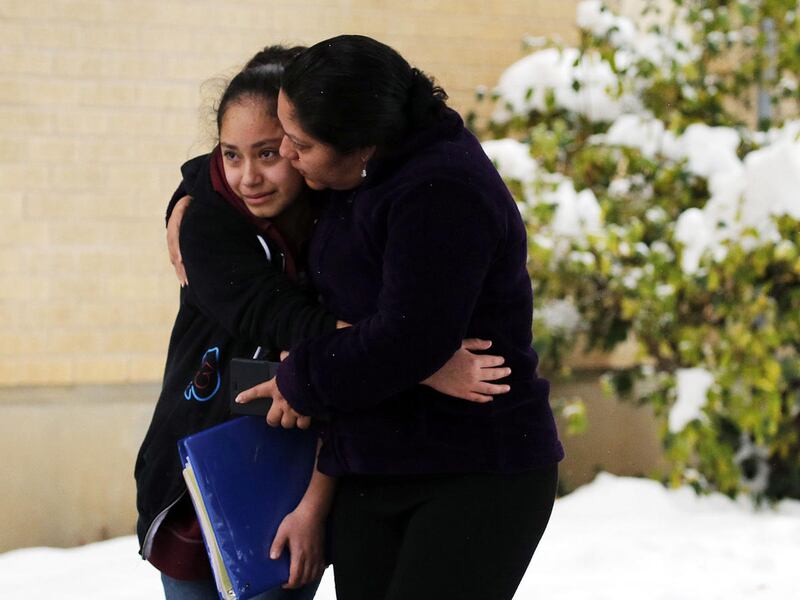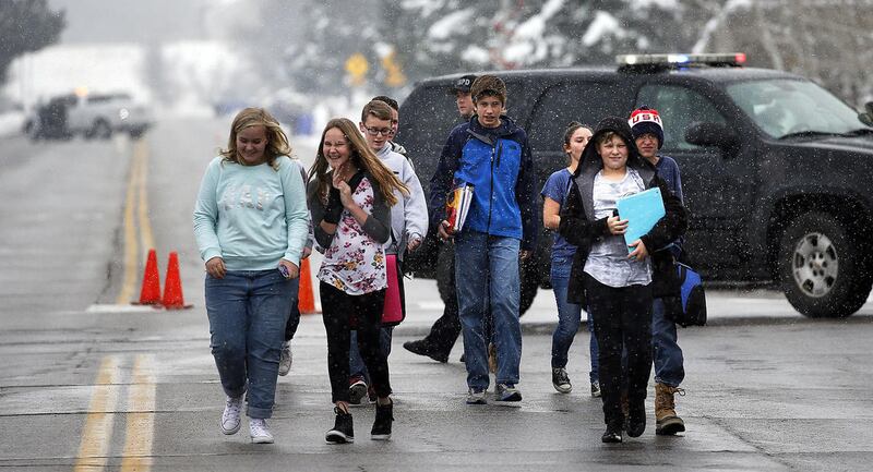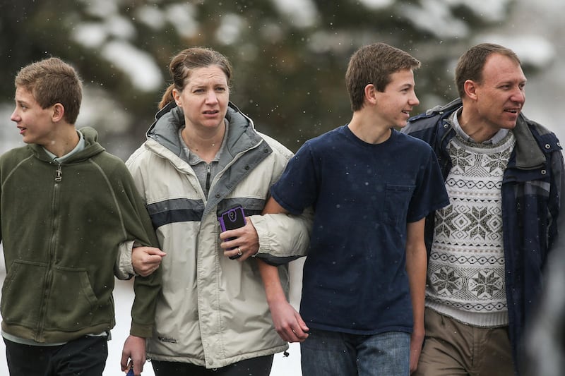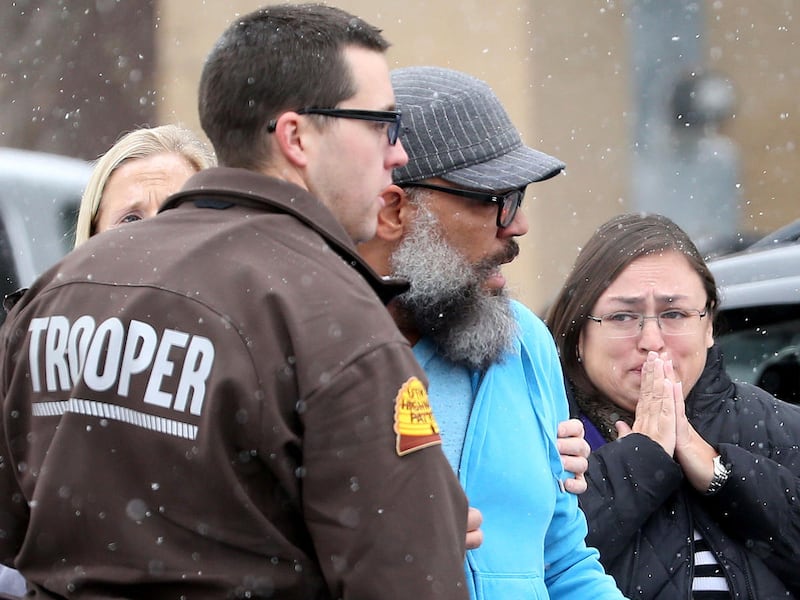 Dozens of anxious parents gathered outside in the snow and at an LDS meetinghouse across the street waiting to take their children home. Many parents and neighbors embraced as they arrived, some shedding tears and others making small jokes. Some were able to text their children inside the building. At least one parent said his son was nervous, but he felt a sense of reassurance because of the police response.